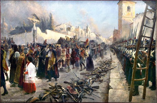 Sin embargo, nada era suficiente para rendir la ciudad. Finalmente, la falta de víveres y un rebrote de tifus hicieron caer a la capital del Ebro. Aun con todo, el general Palafox se resistía a claudicar, haciéndose famosa la frase“guerra y cuchillo” como respuesta a los ofrecimientos para rendirse que hacían los franceses (aunque es algo discutible que lo dijera realmente el propio Palafox). Pero enfermó de tifus y fue reemplazado por Saint-Marq, que con el apoyo de la Junta de Defensa decidió rendir Zaragoza. En una muestra más de dramático valor, algunos partidarios de Palafox que querían continuar la lucha intentaron asaltar los arsenales, aunque fracasaron y la ciudad capituló el 21 de febrero del 1809.