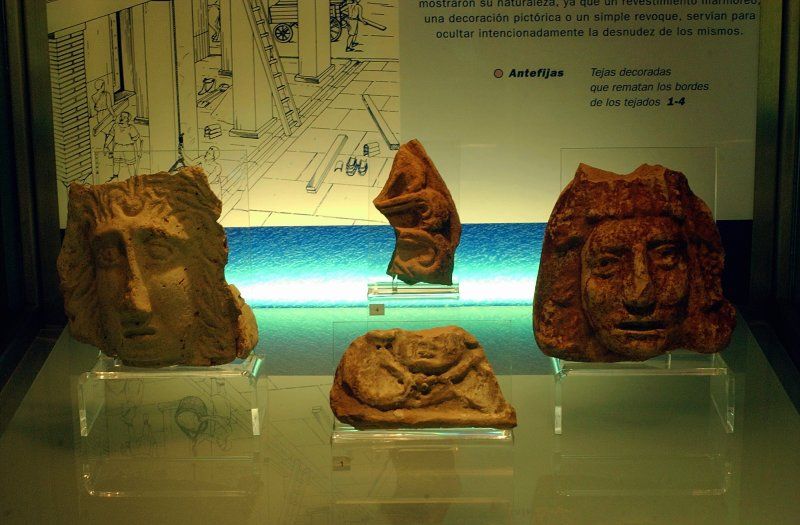 estaban llenos de estatuas; en el teatro romano; en las termas; y en lo que en la época vendrían a ser viviendas de particulares, donde hoy en día se sitúa el casco histórico de la ciudad. De todas las esculturas de Caesaragusta, la más antigua es una antefija que se muestra en la foto situada como cabecera de esta entrada. La fotografía corresponde a una de las vitrinas del museo del foro romano y la antefija de la que estamos hablando sería la que está expuesta en la derecha. Por otra parte, la ilustración que aparece acompañando este párrafo ilustra muy bien lo que sería una antefija, que es un relieve decorativo, que generalmente representa una máscara teatral o rostro femenino, y que se aplicaba a la última de las tejas curvas para que no se viera desde la calle el horrible hueco que se ocasionaba al combinar este tipo de tejas curvas con tejas planas.