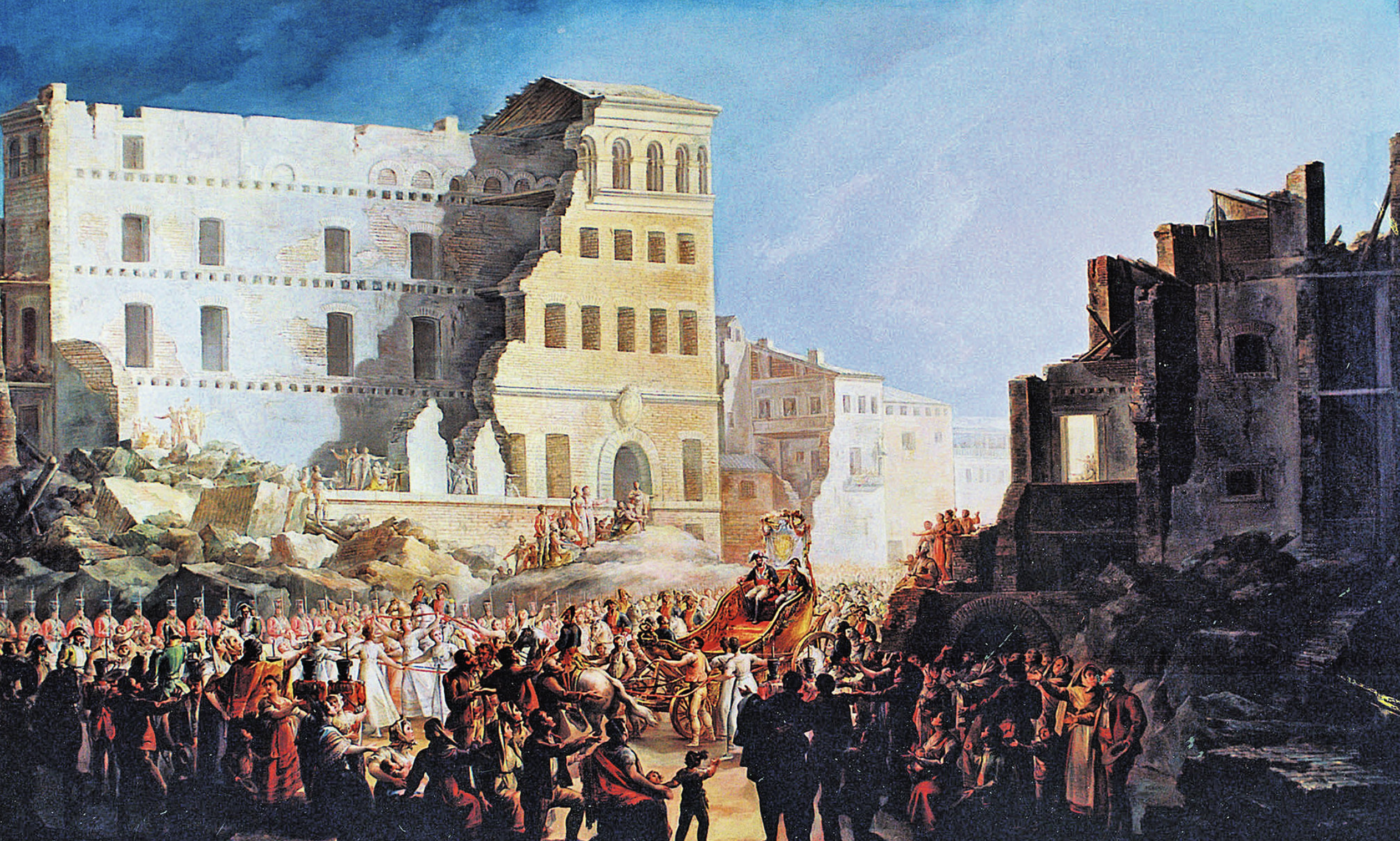 Una de las preocupaciones de las Cortes, o al menos de los diputados de tendencia liberal, era marcar una hoja de ruta del regreso del rey y el asegurarse de que Fernando jurara la carta magna renunciando a sus privilegios como monarca absoluto. Por supuesto, a Fernando no le convencía demasiado eso de perder los poderes de los que habían gozado secularmente sus predecesores, y a su vuelta a España se dedicó a ver con qué apoyos contaba y cuál era el sentir del pueblo. El 22 de marzo de 1814 Fernando VII volvía a pisar suelo español llegando a Figueras, comenzando un periplo que debía llevarle a Valencia, pero del que se acabó desviando hacia tierras aragonesas por petición expresa de José de Palafox, capitán general de Aragón y líder de la defensa de Zaragoza durante los dos asedios que sufrió la ciudad entre junio de 1808 y febrero de 1809. Quería mostrarle al rey las ruinas en que había quedado la capital aragonesa luchando por su regreso y, por supuesto, marcarse un tanto frente al monarca. “Usía, dígale al general que le diga al rey que venga por esta ciudad para que vea lo que hemos hecho por Su Majestad”, fueron las palabras de Palafox. Y allá que fue.