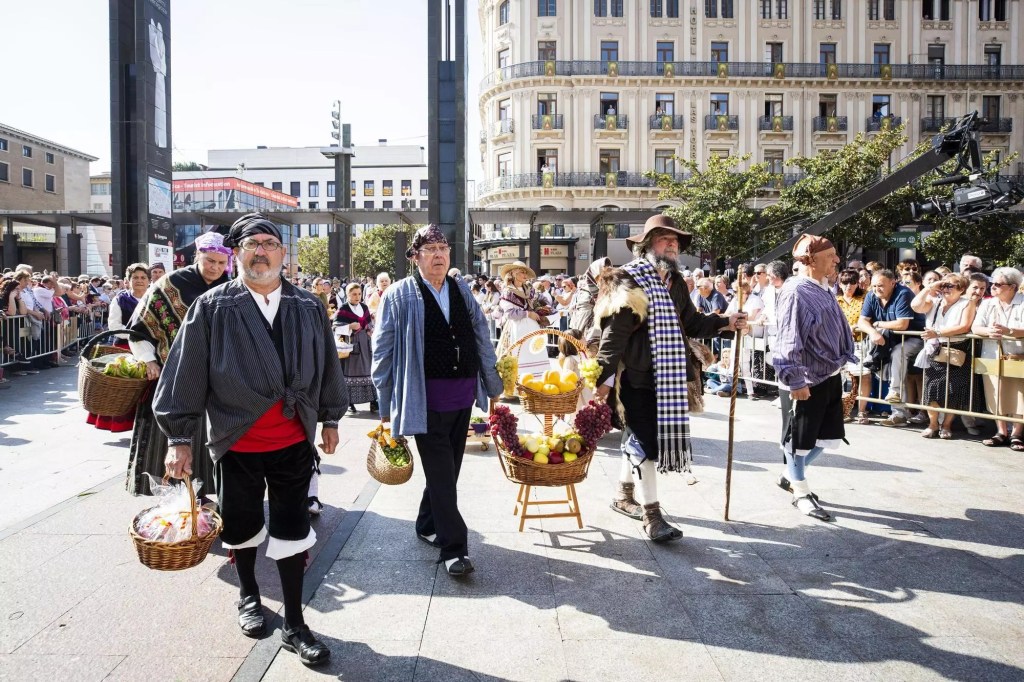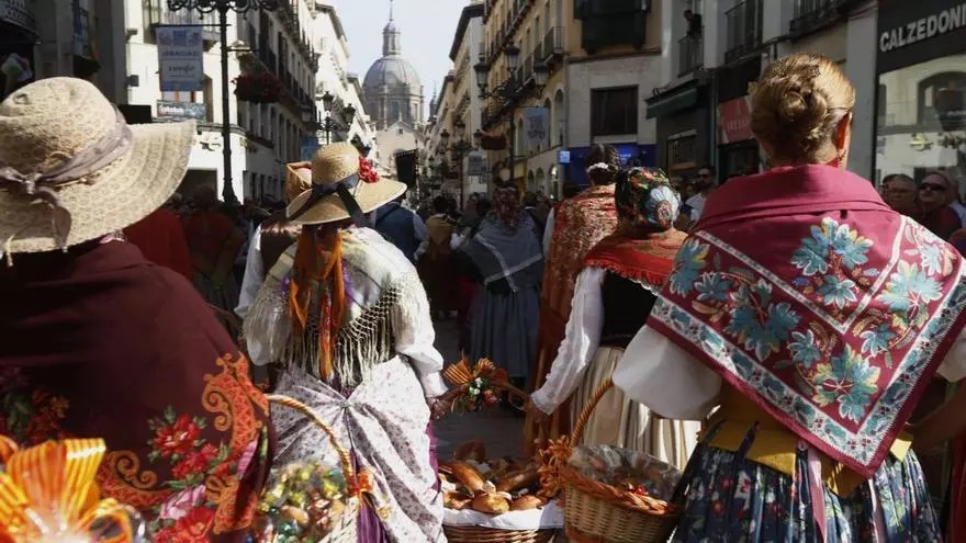 El movimiento de gentes fue tremendo, y para tratar de no perder el arraigo, sus orígenes, tradiciones, costumbres y sus lazos con su tierra natal, se fueron creando las llamadas casas regionales en las que gentes de un mismo lugar se agrupaban para seguir añorando juntos su lugar de nacimiento y fomentar comunidades que conservaran sus raíces. A todo esto, le añadimos el año de comienzo: 1949. España seguía viviendo esos años las terribles consecuencias de la guerra civil y de la larguísima postguerra. De hecho, la famosa carta de racionamiento no se retiró hasta el 1 de abril de 1952. Por eso las casas regionales no solo ofrecían a la Virgen del Pilar aquellos alimentos más típicos de su región, ya fueran comida, postre o bebidas, sino que luego, al igual que se hace hoy en día, esos alimentos eran donados a las gentes más necesitadas, que allá por 1949 eran muchas más que en la actualidad. Así nació un acto en el que miles de personas desfilan, cantan o bailan con sus trajes regionales para mostrar a Zaragoza y al mundo su origen y participar en un acto que en las últimas ediciones recoge ya alrededor de 7.000 kilos de comida.